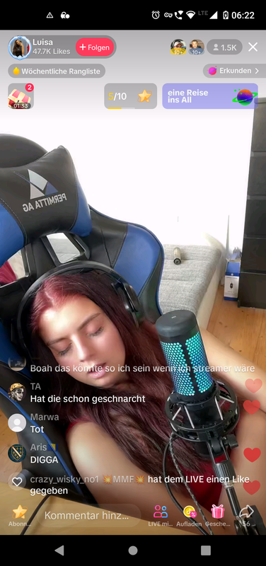 Sie war gerade mit etwa 2.000 Zuschauern in ihrem Livestream aufgewacht, ist aber auch gleich wieder weggepennt. Hat wohl die ganze Nacht durchgemacht bzw. 24h non-stop live gestreamt. Da kann man schon mal kurz wegpennen.