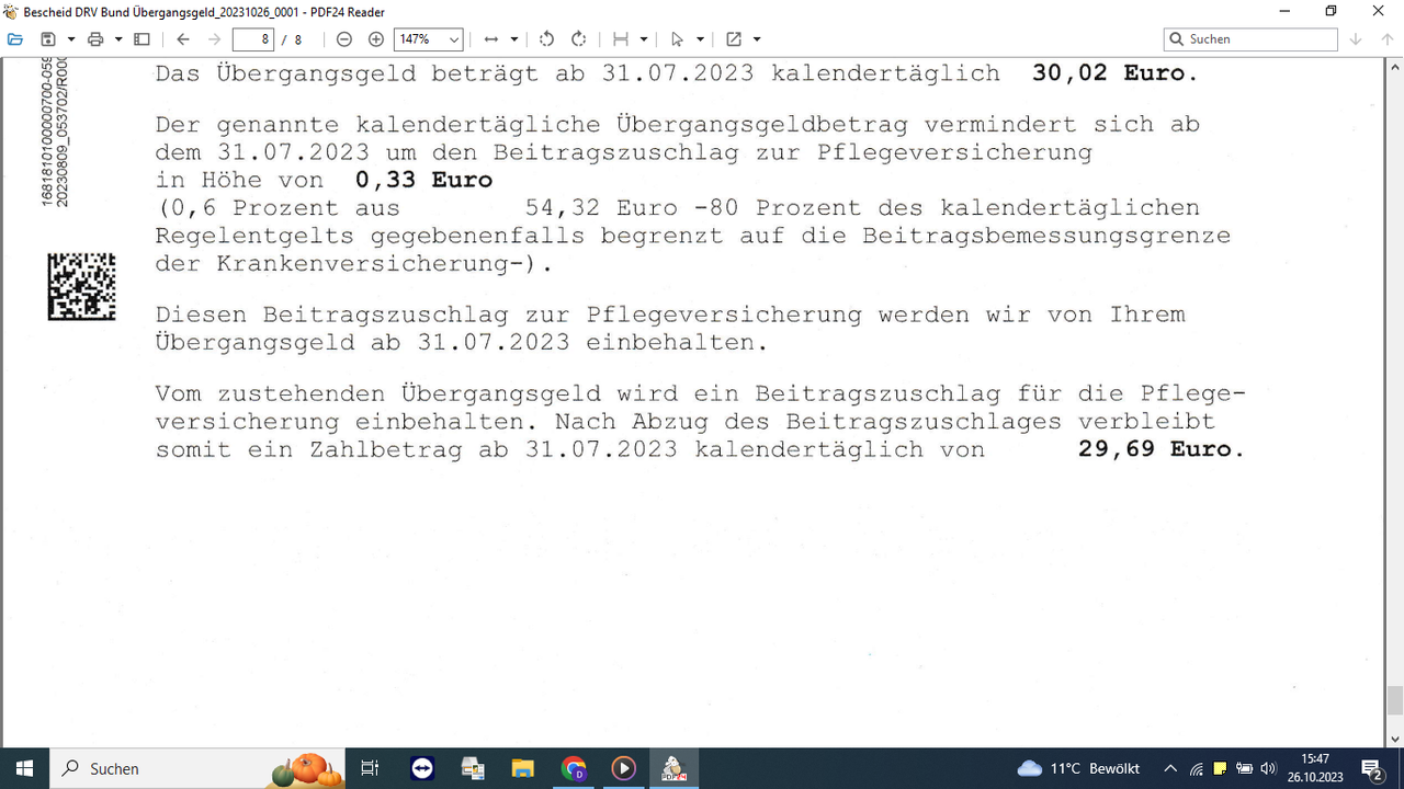 Wenn ich das richtig sehe, bekomme ich für die Zeit meiner Umschulung 29,69 EUR Übergangsgeld am Tag. Wenn ich davon die Miete und sonstige Fixkosten abziehe, ist's ein bisschen weniger.